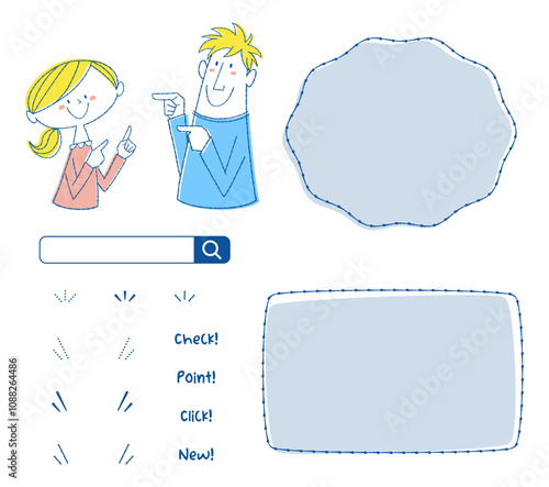 © Torico, Obraz premium 指さしポーズをする若い男性、女性とフレーム、文字と装飾用素材のセット