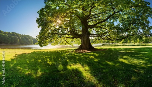 Fototapeta premium 楠の木が豊かな緑の葉で覆い、木漏れ日が地面を照らす。周囲には鮮やかな草が生い茂り、湖が遠くで輝きます。