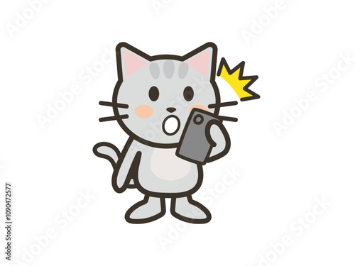 Obraz premium スマホを見てびっくりするかわいいねこちゃんのイラスト