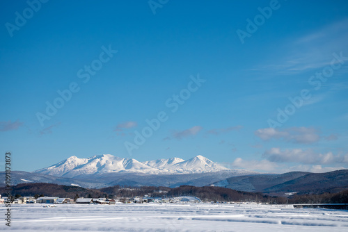 © kinpouge, Fototapeta premium 冬の晴れた日の雪山と積雪の水田