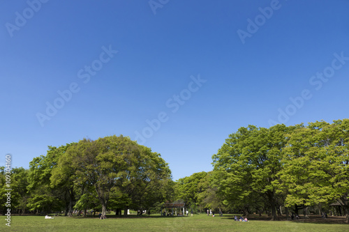 Obraz premium 東京 代々木公園 新緑 青空 春 4月 広場 芝生 人々