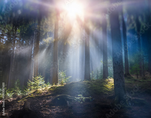 © 100ME, Fototapeta premium 深い森や山奥の静寂の中で光が広がり、内面的な宇宙を象徴する 無限の色彩が自然と融合し、自己探求と自然の調和を映し出す背景イメージ