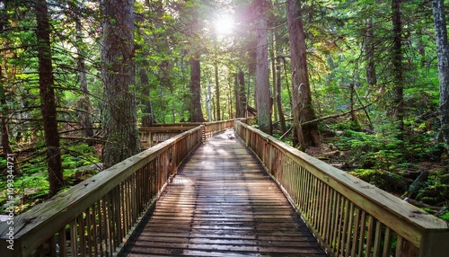 Fototapeta premium 푸른 숲속을 따라 이어진 나무데크 산책로