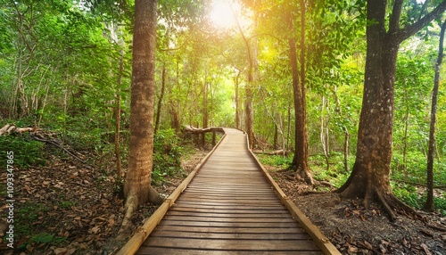© 순단 강, Fototapeta premium 푸른 숲속을 따라 이어진 나무데크 산책로