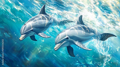 Obraz premium 透き通った海で泳ぐイルカのペア
