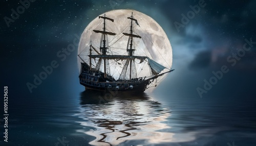 Fototapeta premium 칠흙같은 바다 위를 항해하는 해적선