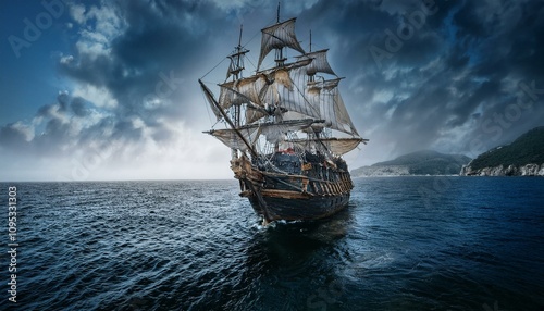 Fototapeta premium 칠흙같은 바다 위를 항해하는 해적선