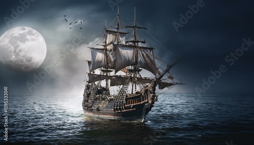 Fototapeta premium 칠흙같은 바다 위를 항해하는 해적선