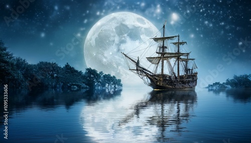Fototapeta premium 칠흙같은 바다 위를 항해하는 해적선