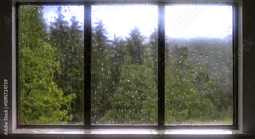 Fototapeta premium 雨の降る山・山林・森林の風景 ガラス窓についた雨粒 滴のついたガラス窓に透ける緑の風景 霧の立ち込める山肌 アウトドア・キャンプの背景イメージ