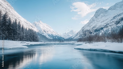 © 炳伟 梁, Fototapeta premium 冬天雪山湖泊河流大雪冬日暖阳