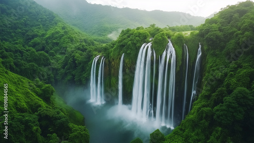 © bephoto, Fototapeta premium 熱帯の緑に囲まれた壮大な滝の風景