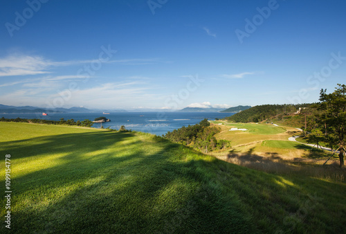 © Cokr, Fototapeta premium 푸른 하늘과 어울어진 바닷가 골프장 풍경.