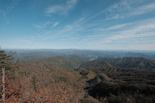 © ROVEWORKS, Fototapeta premium 대한민국 한반도 태백산맥의 산봉우리 정상에서 바라본 푸른 하늘의 구름과 가을 낙옆 단풍 나무숲 능선의 광활하고 시원한 풍경 배경화면
