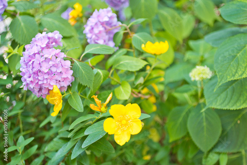 © chiropoko, Fototapeta premium 花 紫陽花と金糸梅
