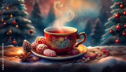 © 문용 최, Obraz premium 크리스마스 분위기의 찻잔 속에서 김이 오르는 차와 옆에 놓인 작은 과자