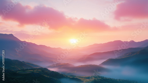 Fototapeta premium 日の出に染まる山脈と穏やかな朝