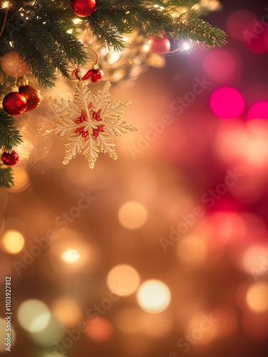 © SOOJIN, Obraz premium "부드럽고 흐릿한 황금빛 보케 배경에 반짝이는 크리스마스 조명이 있습니다. 전면에는 섬세한 빨간색, 녹색, 금색 장식이 보이지 않는 끈에 부드럽게 매달려 있으며, 이미지 전체에 은은한 눈송이가 몇 개 떠 있습니다."