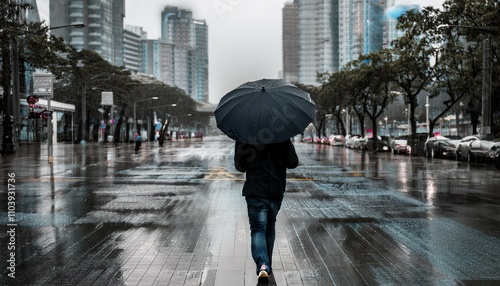 Obraz premium 비 오는 거리에서 우산을 쓰고 혼자 걷는 사람의 뒷모습