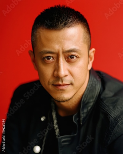 Fototapeta premium 赤い背景の前でポーズをとる男性の肖像