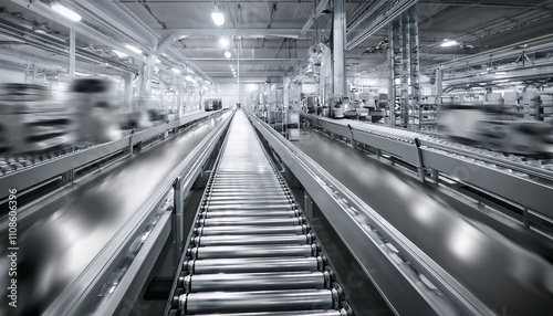 Fototapeta premium 자동화된 생산 라인 위에서 움직이는 컨베이어 벨트와 제품들의 윤곽