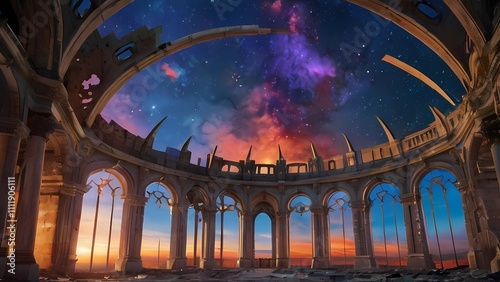Obraz premium ゲーム背景 星空ロマネスク様式ステンドグラスの窓がある廃墟教会ホール