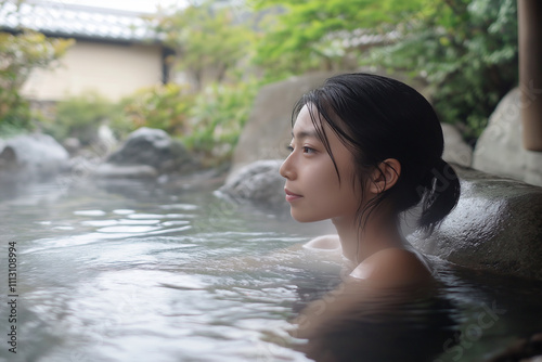© CrioStudio, Obraz premium 自然に囲まれた露天風呂でリラックスする女性