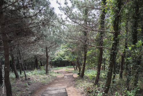 © 고은 주식회사, Naklejka premium 산을 올라가는 삼나무 숲길, 제주 제주시 구좌읍 종달리 지미봉