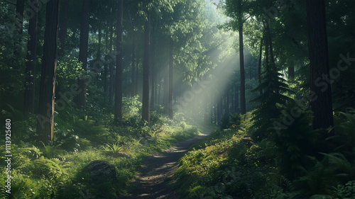 Fototapeta premium 木漏れ日が差し込む緑豊かな森の小道