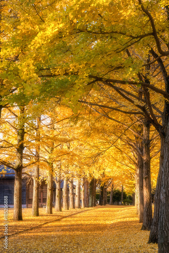 Obraz premium 茨城県立歴史館 銀杏並木と黄色い絨毯のような路