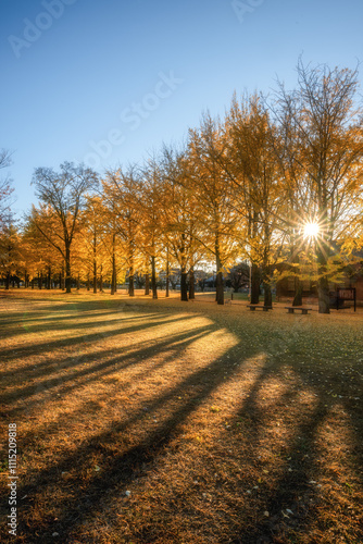 Obraz premium 茨城県立歴史館 銀杏並木と黄色い絨毯のような路