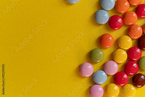 © rai, Obraz premium 黄色背景に並ぶカラフルなチョコレート