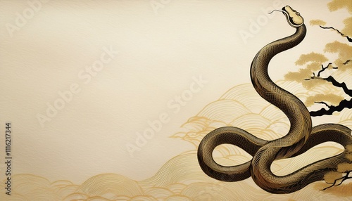 Obraz premium 控えめな蛇のシルエットと金箔ラインが描く、和のエレガントな背景