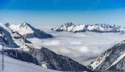 Obraz premium 산꼭대기 풍경 눈으로 덮인 산봉우리와 그 아래로 펼쳐진 운해