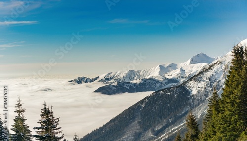 Obraz premium 산꼭대기 풍경 눈으로 덮인 산봉우리와 그 아래로 펼쳐진 운해