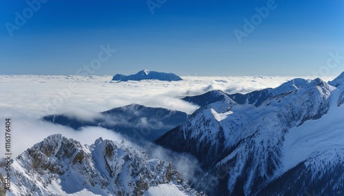 Obraz premium 산꼭대기 풍경 눈으로 덮인 산봉우리와 그 아래로 펼쳐진 운해