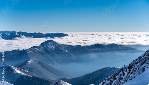 Obraz premium 산꼭대기 풍경 눈으로 덮인 산봉우리와 그 아래로 펼쳐진 운해