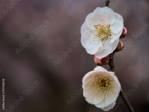 Obraz premium 曇天の3月に咲いた可愛らしい白い梅の花をアップで撮影