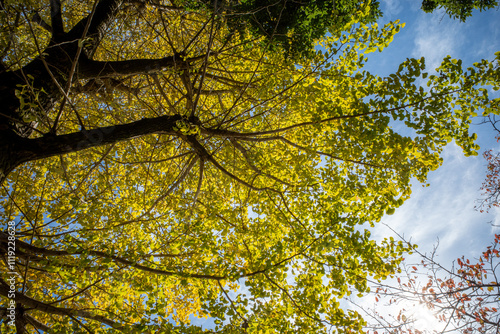 © garcon daily photo, Fototapeta premium 秋の空に色づき始めたイチョウの葉