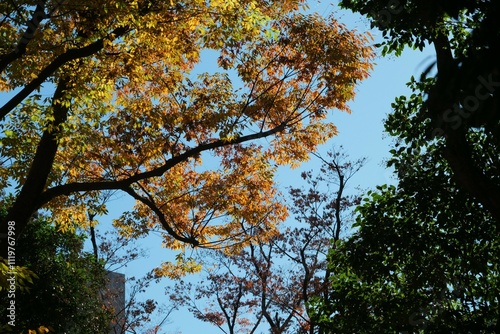 © Honki_Kumanyan, Fototapeta premium 葉が色づいた樹木を見上げる