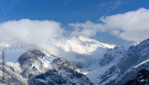 Obraz premium 산봉우리 위로 하얀 눈과 함께 흐릿하게 드리운 구름