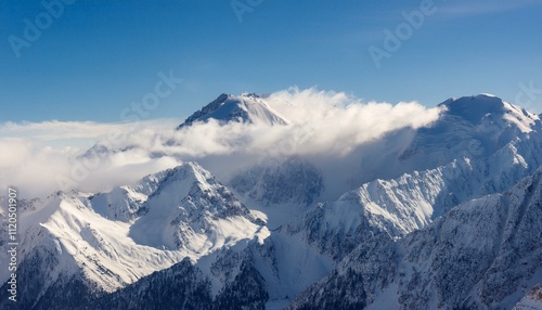 © 문용 최, Obraz premium 산봉우리 위로 하얀 눈과 함께 흐릿하게 드리운 구름