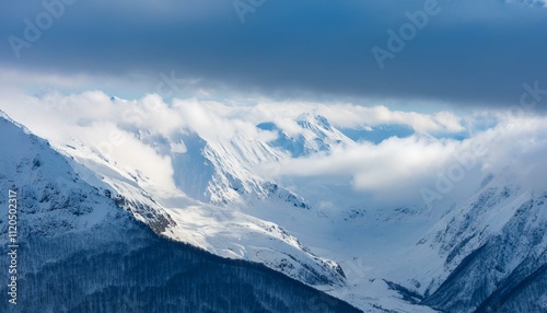 Obraz premium 산봉우리 위로 하얀 눈과 함께 흐릿하게 드리운 구름