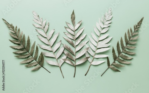 © pham, Naklejka premium 緑の背景に配置された様々な形状の葉のアレンジメント
