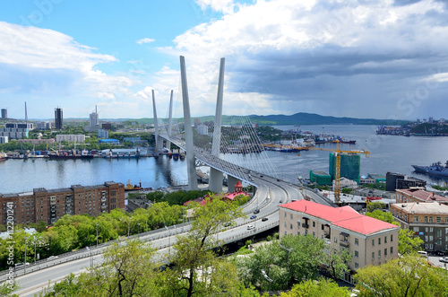 Obraz premium Мост во Владивостоке через залив Золотой Рог в облачную погоду