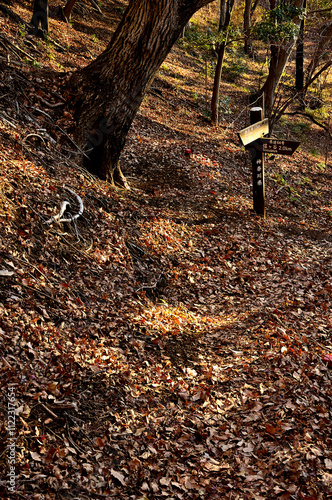 Obraz premium 朝日の登山道 丹沢の大山三峰 コナラの森
