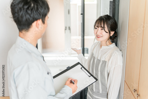 © buritora, Obraz premium バスルーム・お風呂・浴槽・浴室の点検をお願いする主婦の女性