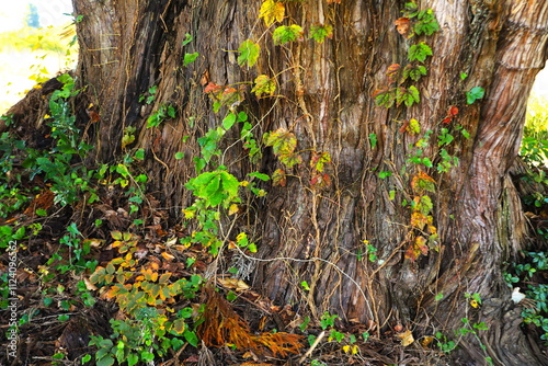 © 写真小僧, Fototapeta premium 大杉の幹とツタ紅葉