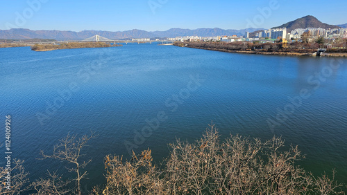 © 근영 장, Fototapeta premium 대한민국 강원도 춘천시 의암호수와 산, 하늘이 있는 도시 풍경