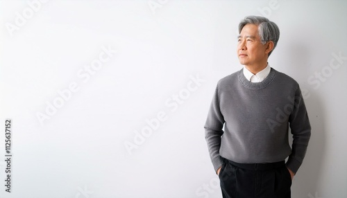 © Shousei, Fototapeta premium 白い背景の隅に立ち、首をかしげて落ち着いた表情を浮かべているアジア系の高齢男性。白髪の短髪、グレーのセーター、黒いスラックスの服装が、彼の穏やかで優雅な雰囲気を作り出しています。